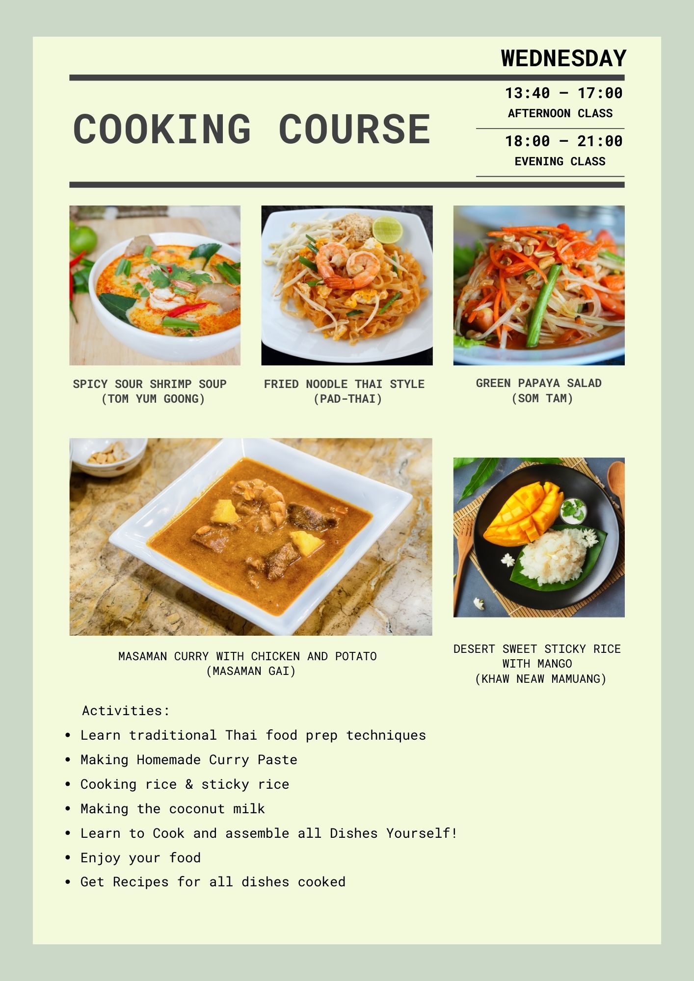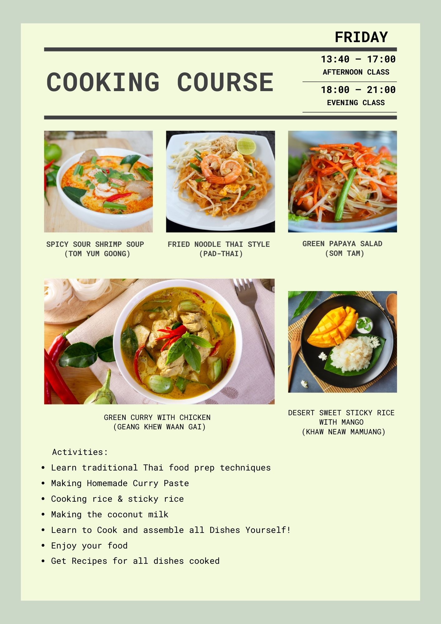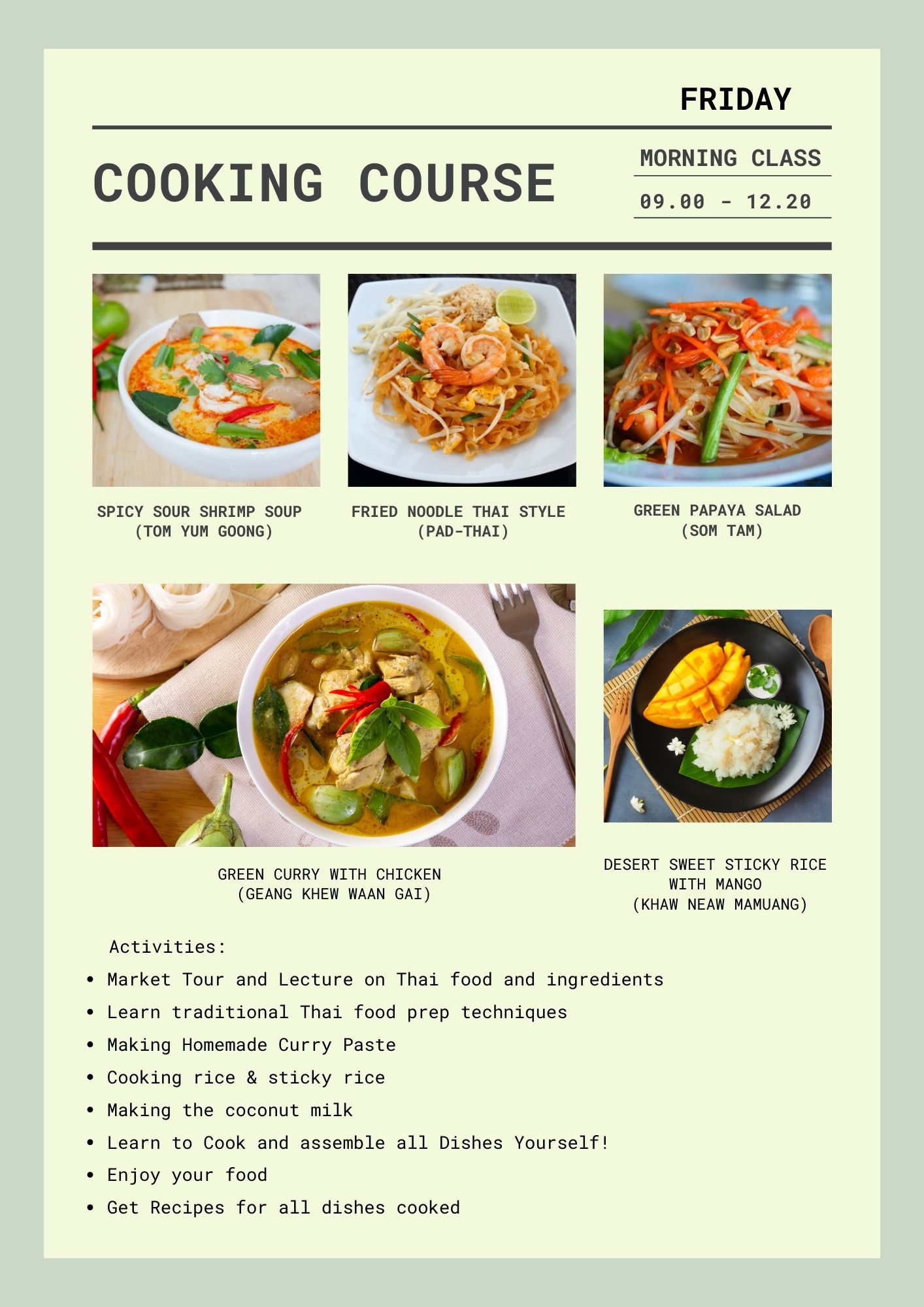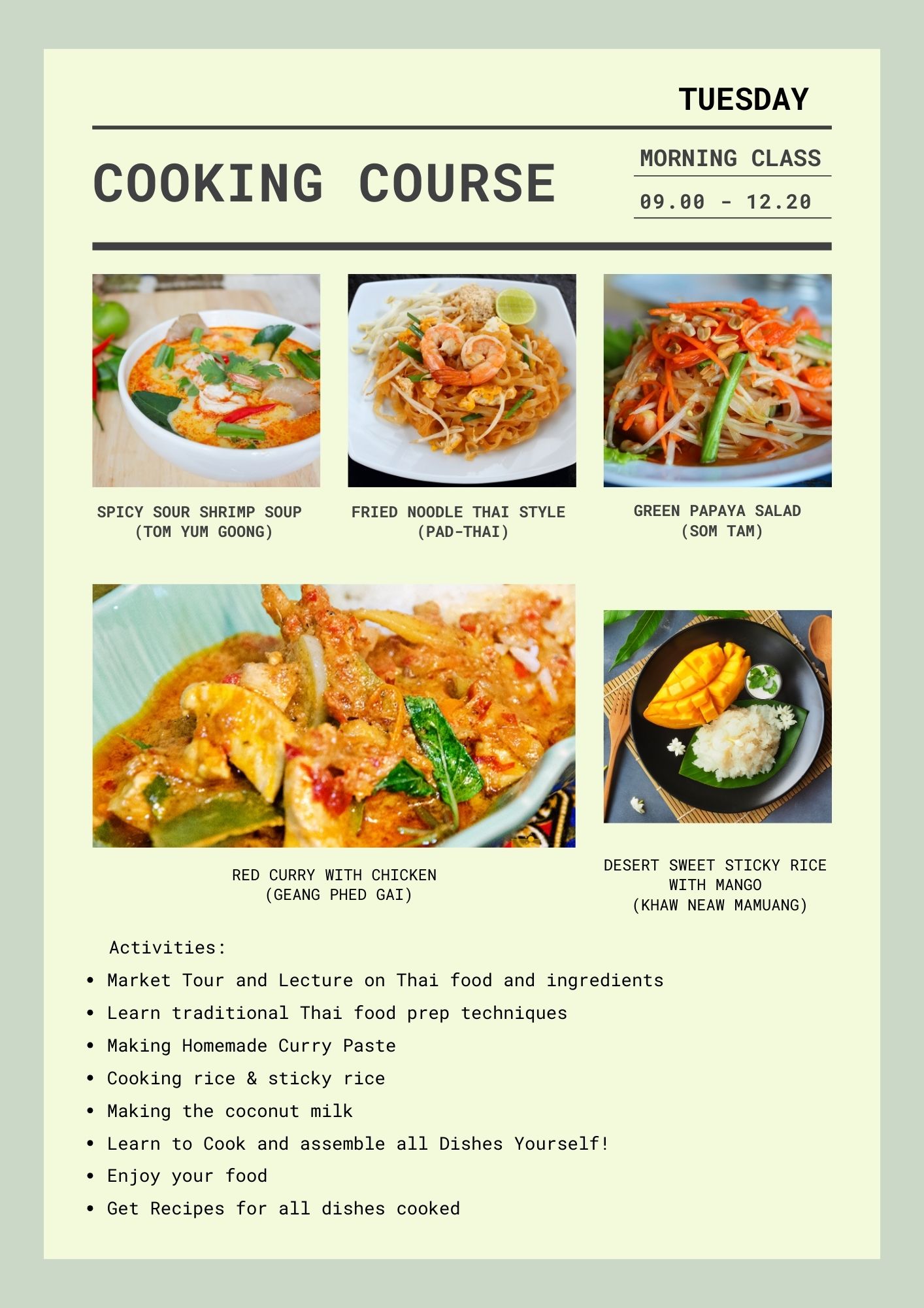 • Receive recipes for all the dishes cooked during the class, so you can replicate them at home and share the flavors of Thailand with your loved ones.